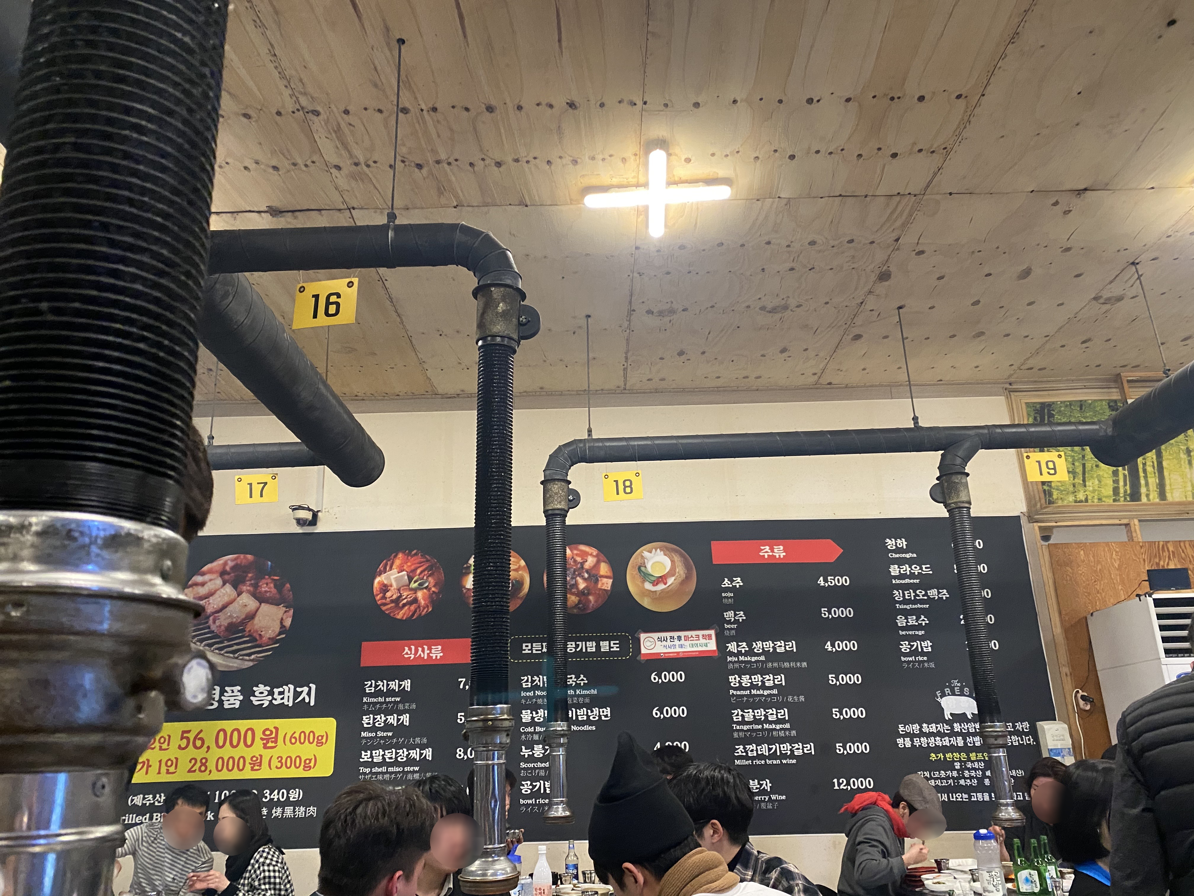 사람이 너무 많아서 매장 사진을 잘 못찍었어요. 보통 포스팅을 위해서 메뉴판은 반드시 찍는데 제주도 흑돼지 맛집 돈이랑은 벽 여기저기에 큰 벽보로 메뉴판이 있더라구요.