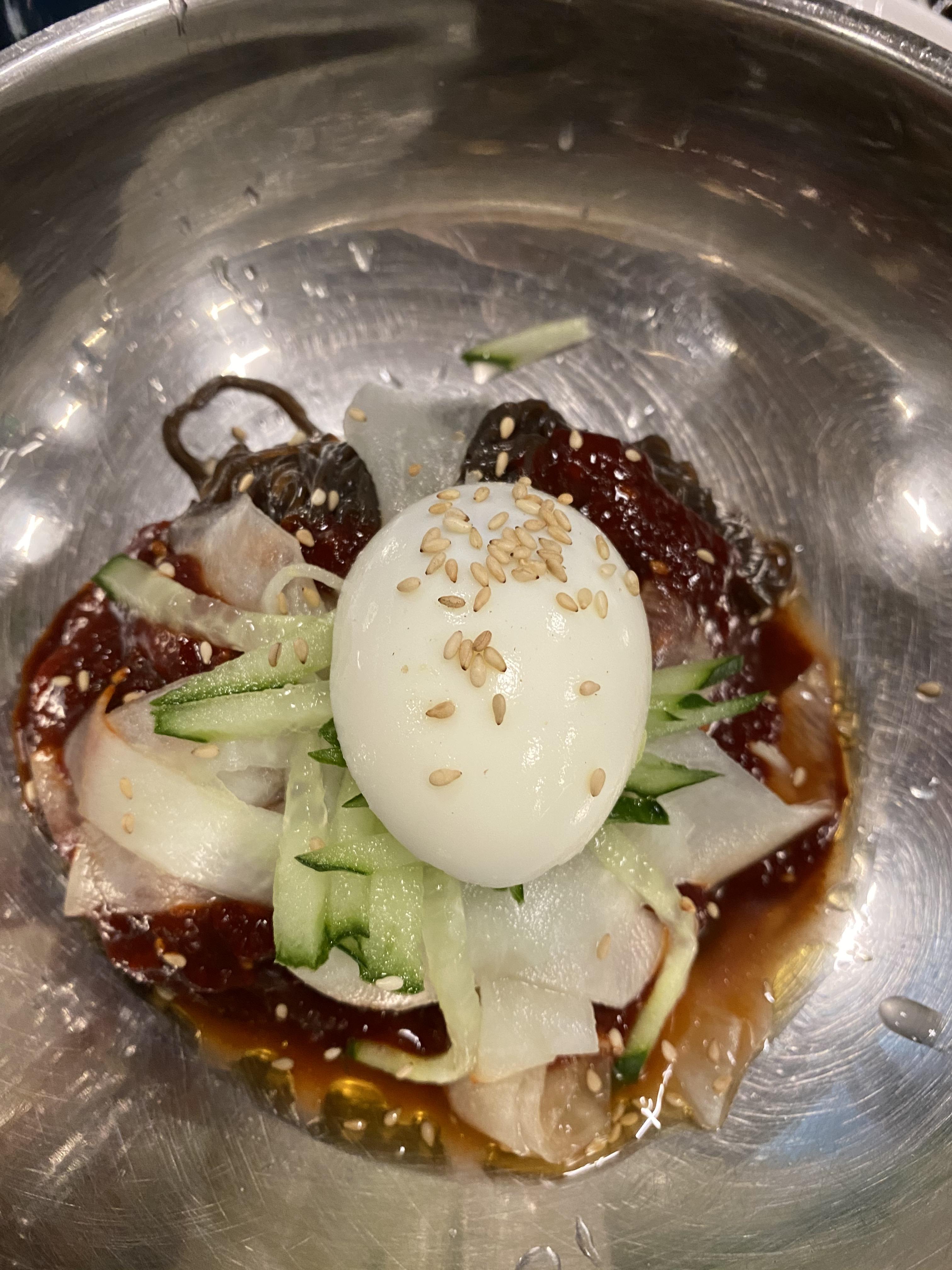 제주도 흑돼지 맛집 돈이랑의 비빔냉면 비쥬얼입니다. 분명 예전에는 항상 물냉만 먹었던 것 같은데 어느 날부턴가 비냉을 자주 시키게 되었어요.