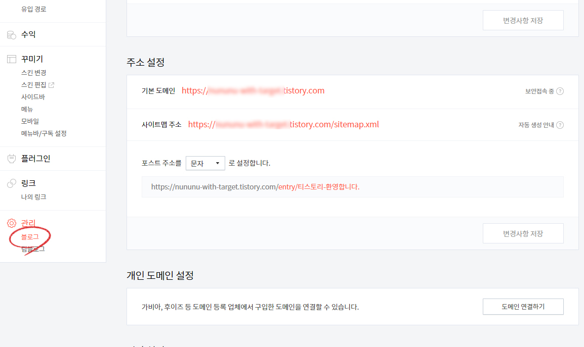 밑으로 쭉 내리면 '관리'에 '블로그'가 있죠.