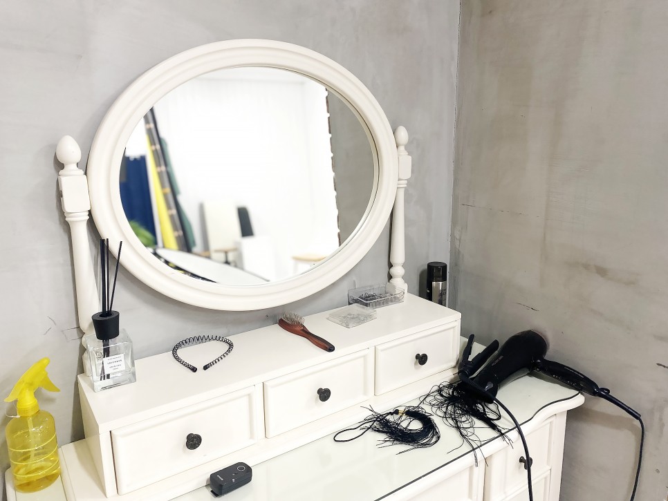 화장대에서 거울 보면서 머리 좀 매만졌고