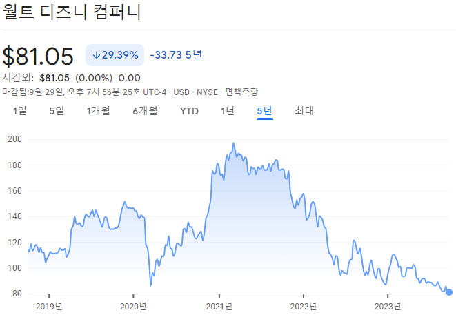 최근 5년간의 주가를 보면 더욱 좋지 않음을 알 수 있습니다. 코로나가 한창이었던 2020년과 비슷하죠. 코로나 이후 월트디즈니의 주가는 크게 올라왔지만 가장 정점이었던 200달러를 찍은 뒤 아주 오랫동안 하향곡선을 그리고 있습니다. 100달러 즈음일 때에도 꽤 괜찮아보였는데 너무 하향선이라... 참 알 수 없네요.