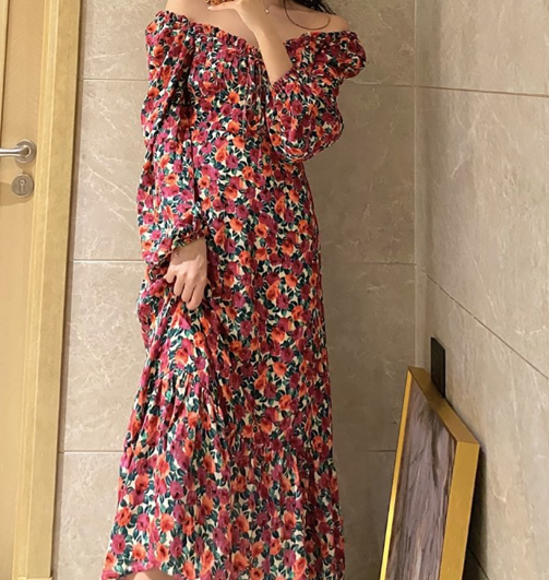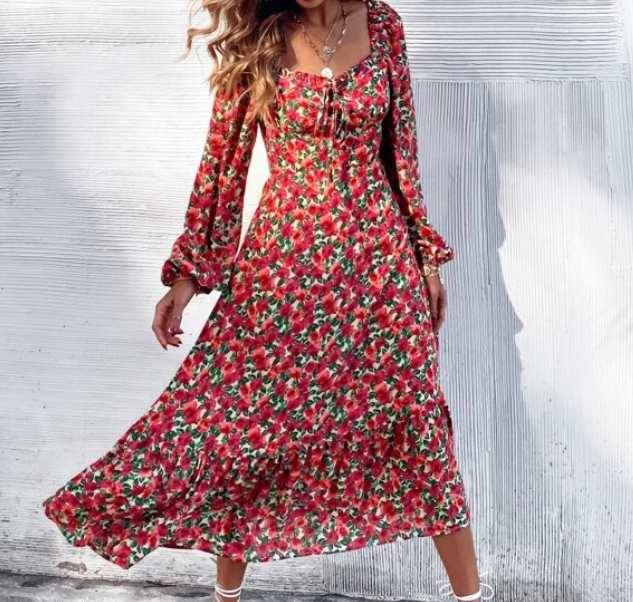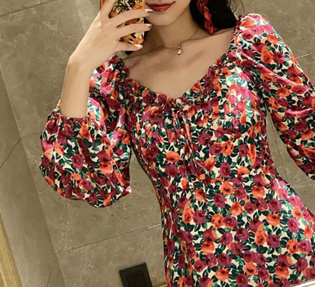 다담패키지 여성용 장미패턴 하트넥 소매 볼륨 원피스 HR725