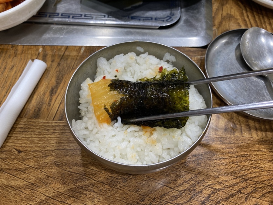 I never get tired of eating kimchi stew with kimchi wrapped in seaweed and I keep eating it. I empty the entire bowl in no time lol.